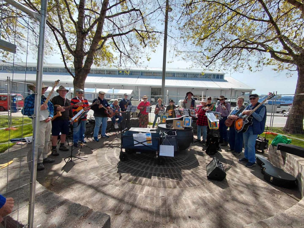 The Hobart Old Time String Band plays alongside the Salamanca Market in Hobart for a few hours on Saturdays whenever the weather is kind and we are available. On this occasion there was fencing around the area where we usually set up; we were assured it was to keep people off new grass rather than keeping us under control!